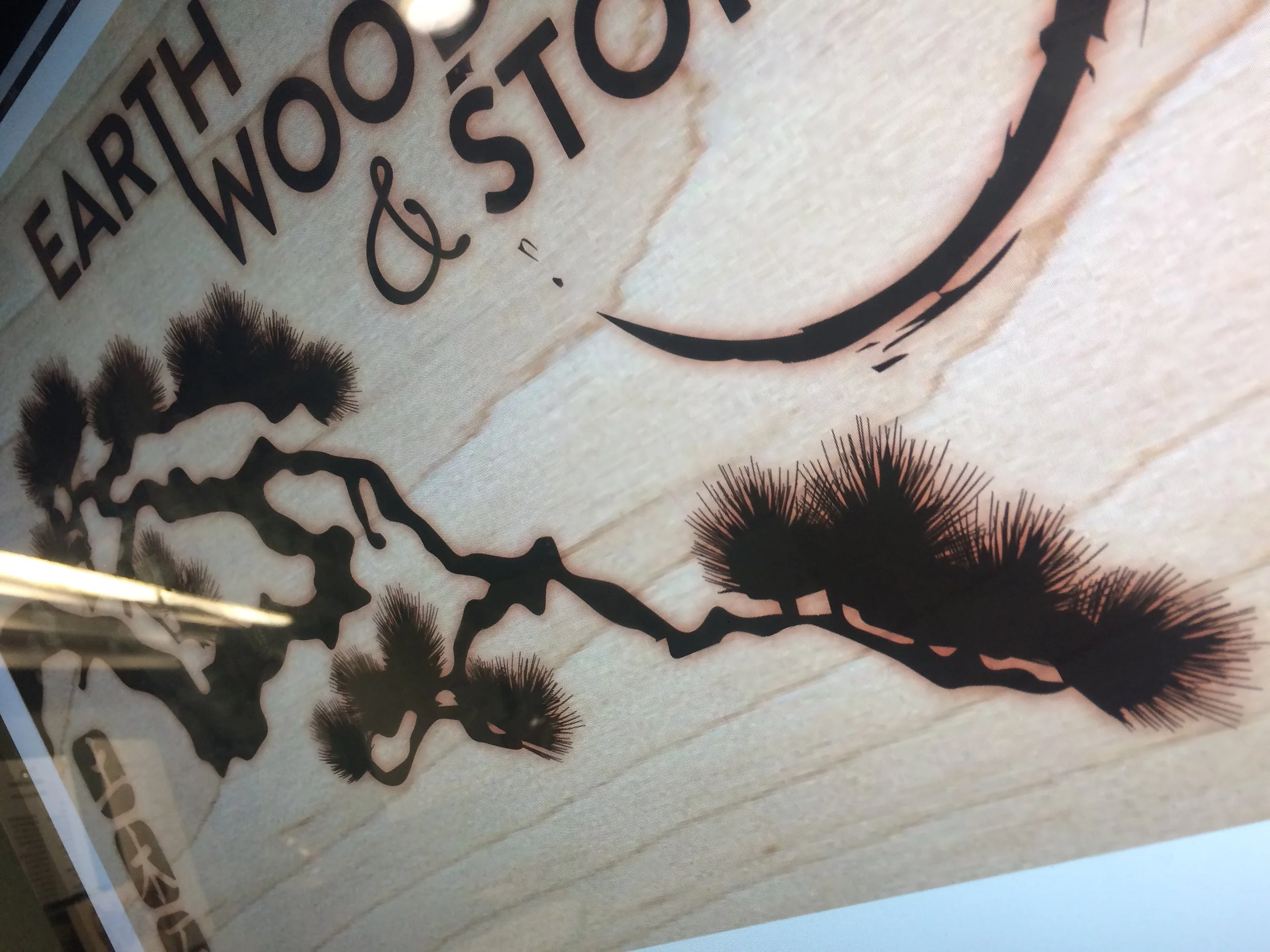 Close-up image of a starry night scene with a crescent moon, stars, and detailed silhouettes of pine trees on a mountain landscape. View fullsize