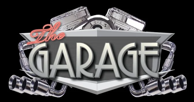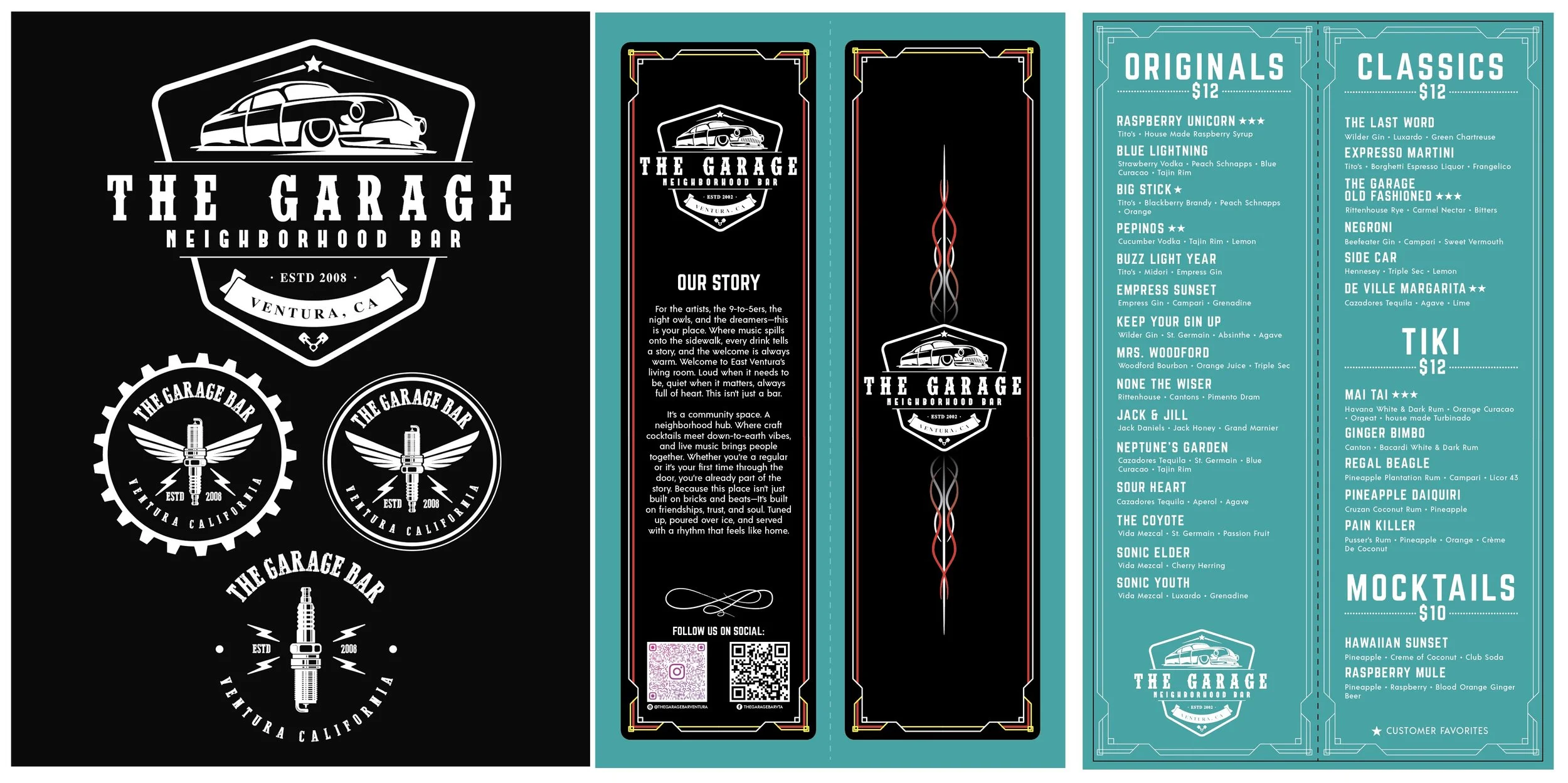 Triptych menu and signage for The Garage Neighborhood Bar in Ventura, California, featuring bar logos, history, and drink menu categories with listings and prices.